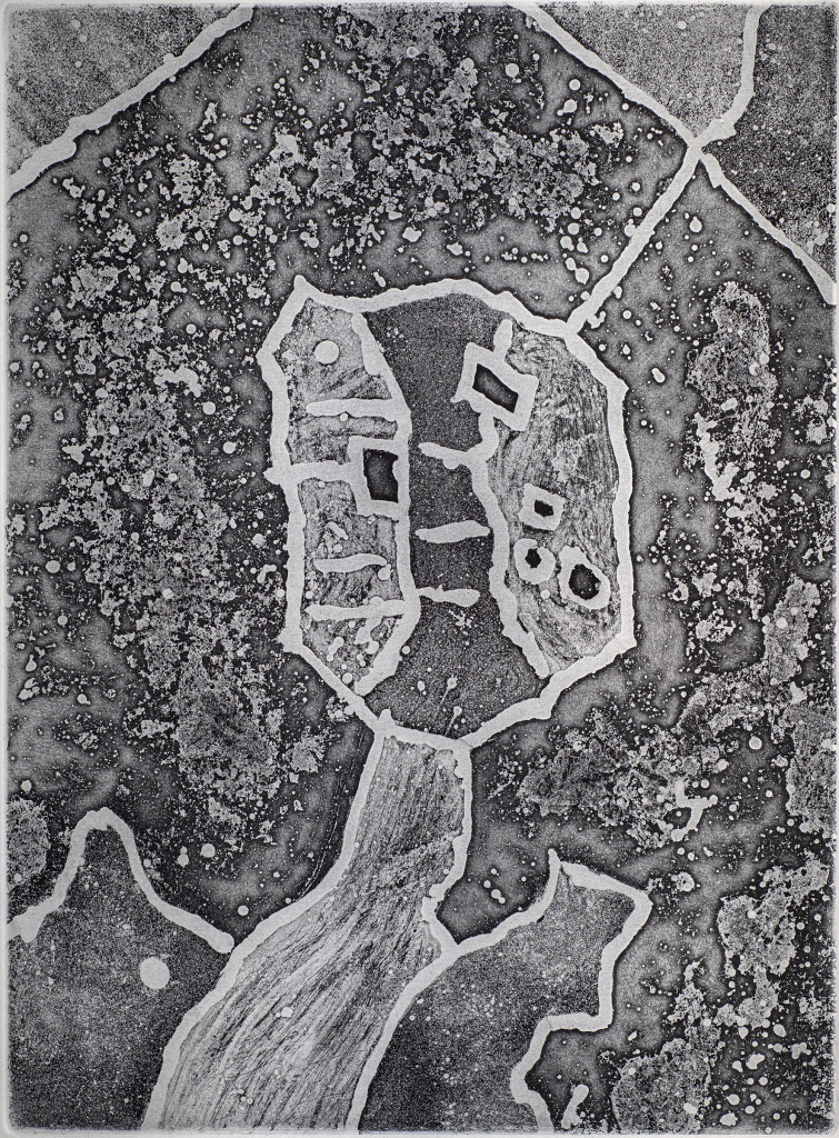 Segni del Paesaggio Agrario” è un’opera parte di un progetto di ricerca omonimo che intende analizzare i segni stratificati in secoli di attività umana sul territorio delle Murge. Forme all’apparenza astratte sono in realtà l’interpretazione di strutture rurali, masserie, jazzi (antichi ovili) e divisioni di campi. La particolare matericità offerta dalla lastra di ferro sotto l’azione dell’acido si presta a rappresentare in maniera quasi tangibile le forme e le asperità del suolo lavorato da secoli di pastorizia e agricoltura in un territorio dove gli uomini del passato hanno imparato a sfruttare saggiamente le risorse offerte dalla natura. I solchi nella lastra riprendono allora le direttrici segnate dai muri a secco e i canali scavati per la raccolta delle acque e, ancora, le diverse campiture riprendono le aree calpestate dagli armenti o i pascoli brulli e stepposi. La scelta di adottare una rappresentazione monocromatica viene dalla volontà di esaltare le forme e le sfumature date dal lavoro e dalla vita di uomini e bestie ad un paesaggio quasi monomaterico.