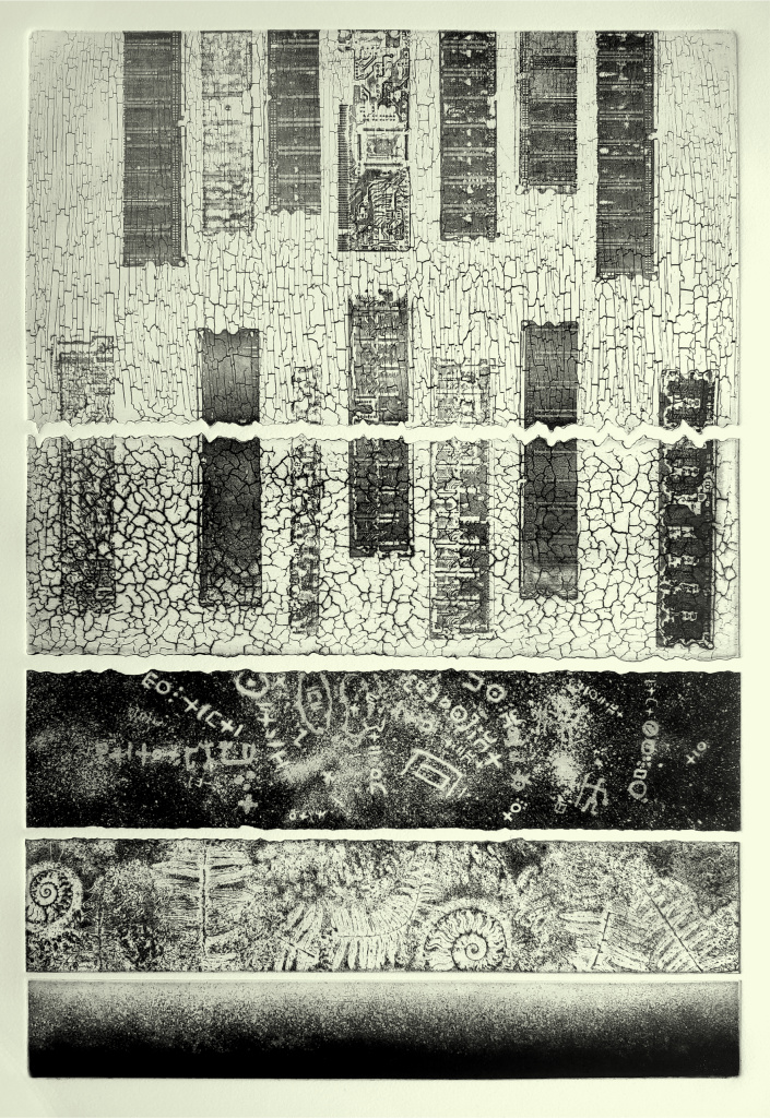 L’opera, composta dalla successione di cinque matrici in rame, è pensata come una “sequenza stratigrafica” immaginaria proiettata nel futuro. Seguendo un ordine ascendente con taglio sempre più irregolare e sincopato, la composizione si sviluppa come narrazione dell’esistenza di un mondo che volge alla sua fine: dalla vita primordiale l’elemento umano emerge, nella sua incessante ricerca di spazio. Domina a questo punto la tecnologia, nuova “natura” creata dall’uomo.